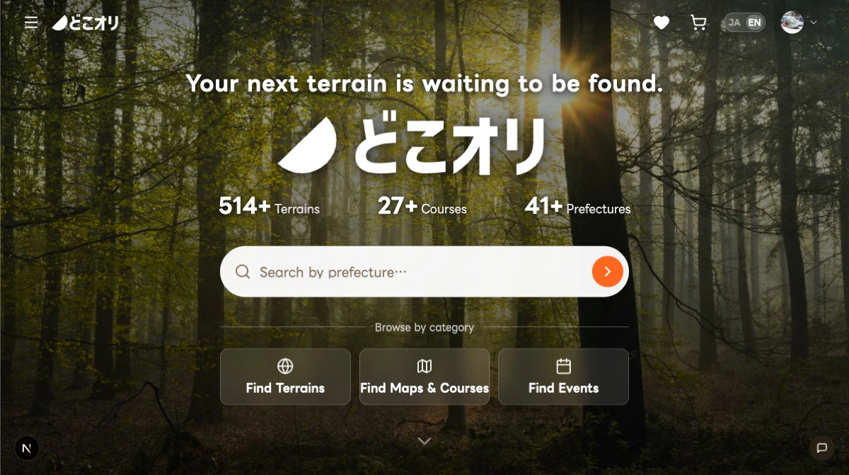 The entire site has been redesigned. The homepage hero section now features the tagline "Your next terrain is waiting to be found" alongside stats — 514+ terrains, 27+ courses, and 41+ prefectures — plus clear category navigation to terrains, maps, and events.